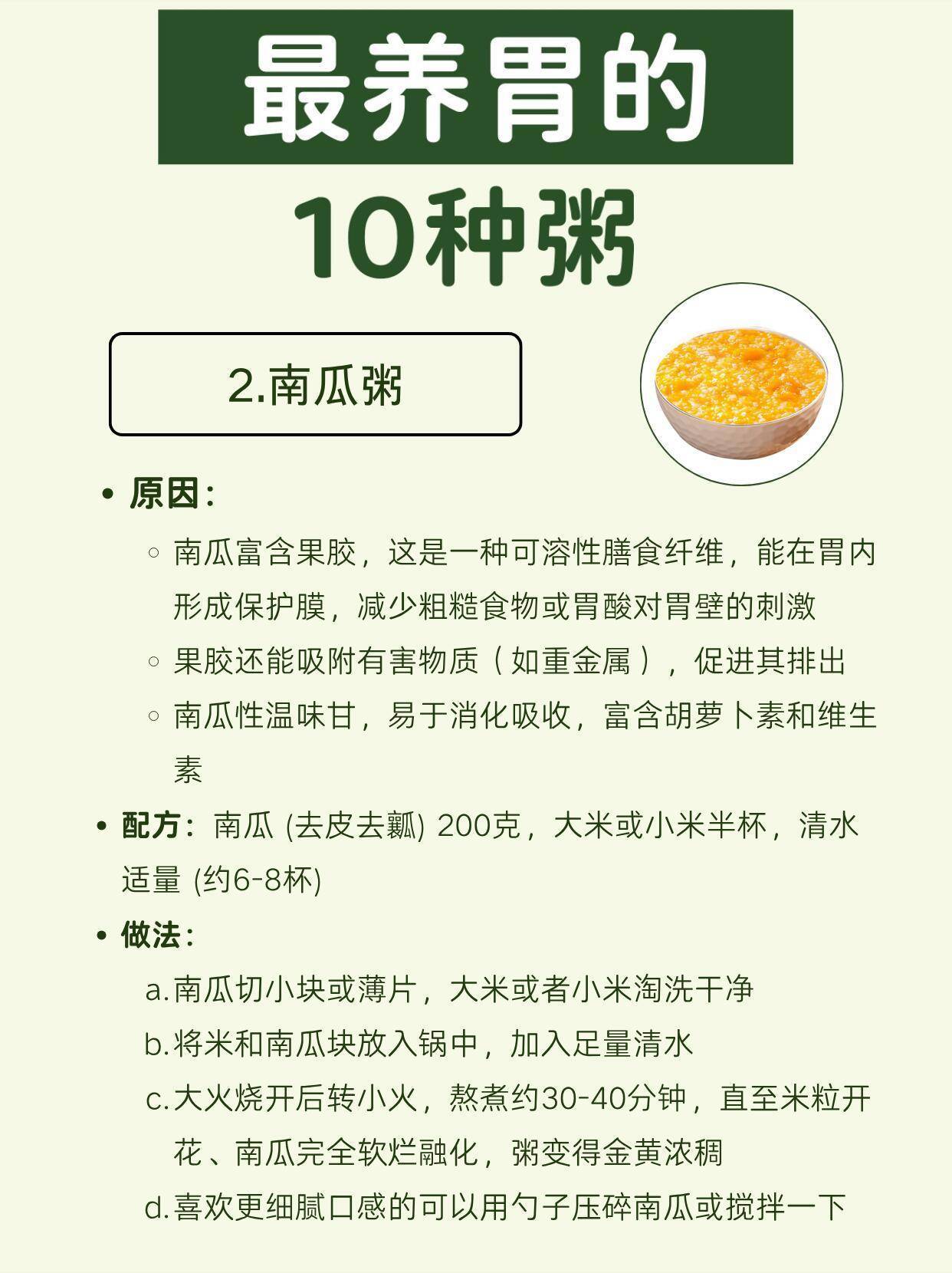 2. 南瓜粥:果胶形成胃保护膜,温和不刺激,老人小孩都适合。