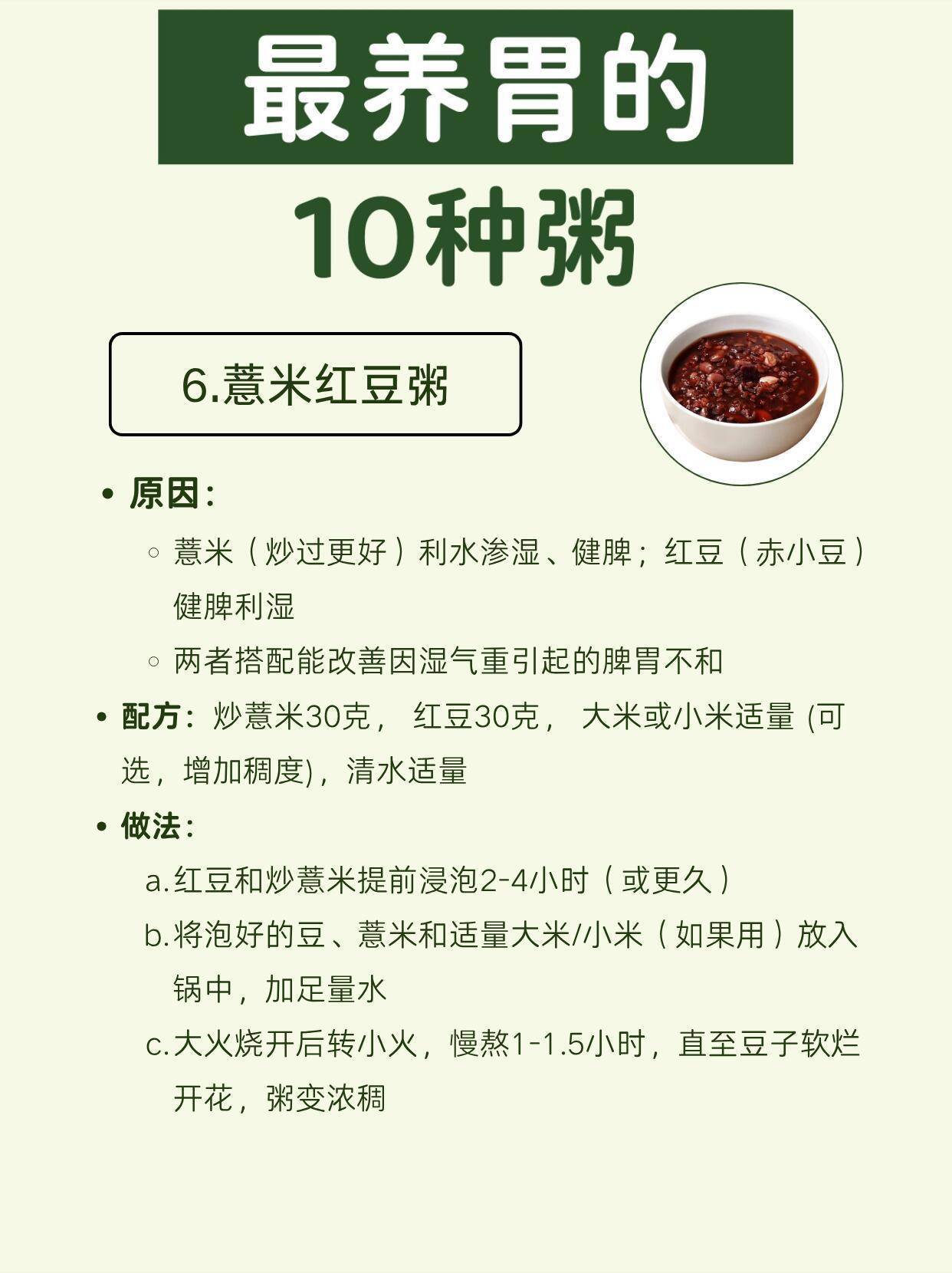 6. 薏米红豆粥:炒薏米+红豆,健脾祛湿,改善湿气重导致的脾胃不和。