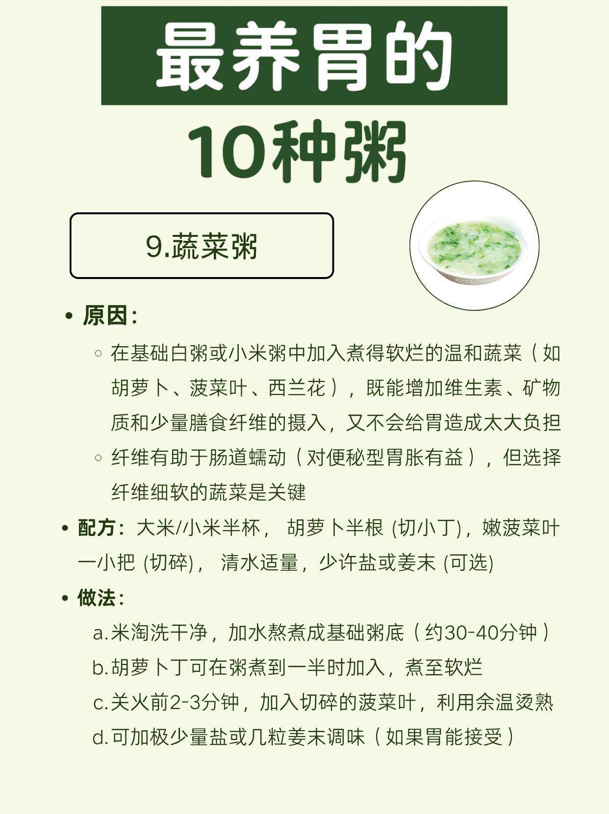 9. 蔬菜粥:软嫩蔬菜加粥底,补维生素不加重胃负担,还能促肠道蠕动。