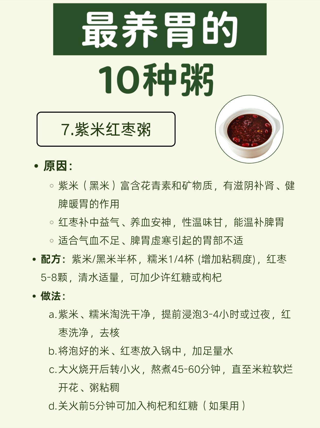 7. 紫米红枣粥:暖脾暖胃,补气血,适合脾胃虚寒、气血不足的人。